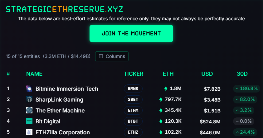 Screenshot of top 5 ETH treasury companies from Strategic ETH Reserve