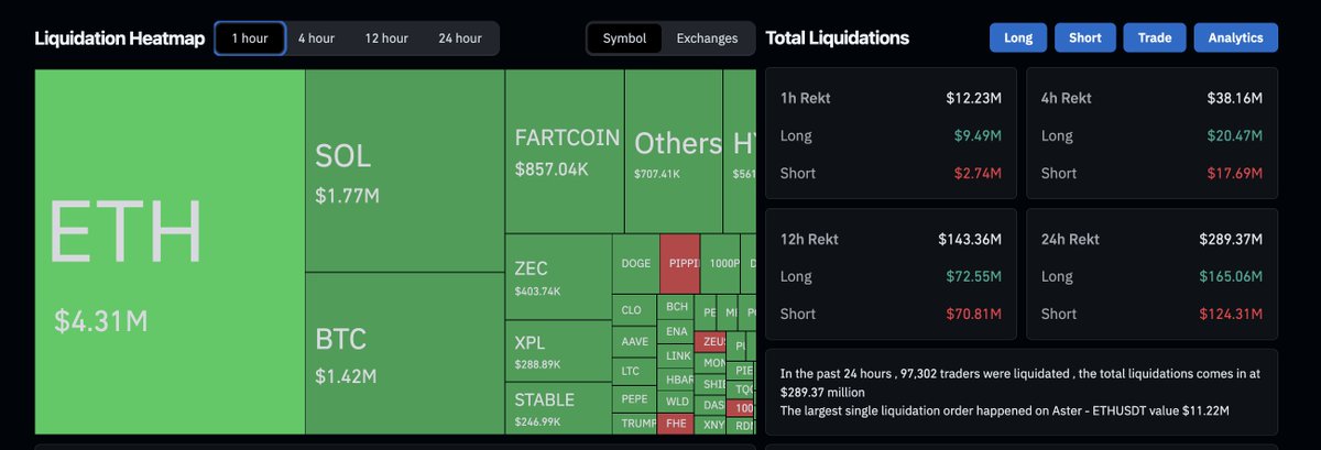 コーヒーでも飲みながら話す感覚で分解しよう—専門用語の乱発はしない。清算はレバレッジ取引が裏目に出たときに起きる:ポジションがマージンコール基準を下回ると強制決済され、担保は消える。今回の場合、ロング(価格上昇を期待する買い)がショートよりもひどくやられており、1億6,500万ドルがレク(大損)され、ショートは1億2,400万ドルだった。97,000人以上のトレーダーが痛みを味わい、最大の単一消失はAster exchangeでの11.22百万ドルのETH/USDTオーダーだった。痛い。