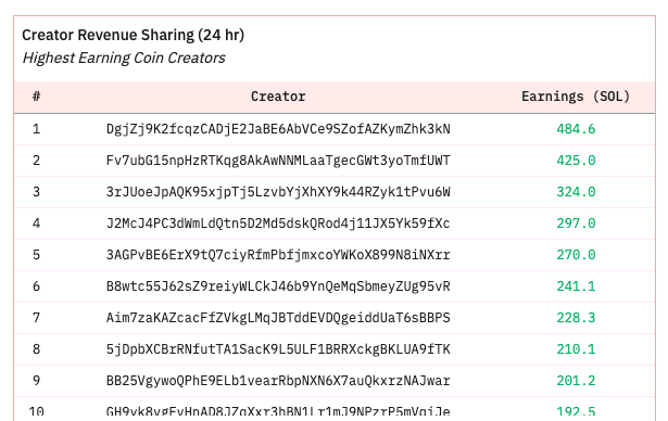 これらは匿名のウォレットアドレスですが、プラットフォーム上でボリュームを牽引している主要プレイヤーを示しています。トップの収益者だけで約485 SOLを獲得しており、当時のレートで約65,000ドルに相当します。
