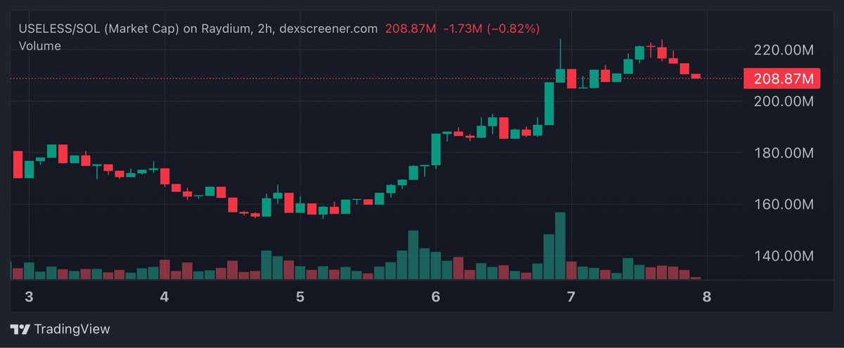 上のチャートは DexScreener から引かれ、ツイートで共有されたものです。Raydium—$USELESS が取引される人気の Solana DEX—のここ数時間を見ると、時価総額は約2.08億ドルでわずかに0.82%の下落にとどまっています。しかし広い目で見るとローソク足の動きは耐性の物語を語っています:赤圧力に押し返す緑の足があり、出来高もサポートのために急増しています。