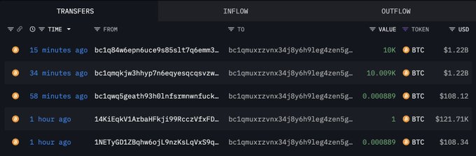转出10,009枚BTC(12.2亿美元) - 还有一些小额交易,包括1枚BTC及若干零散小数,总计20,009枚BTC。