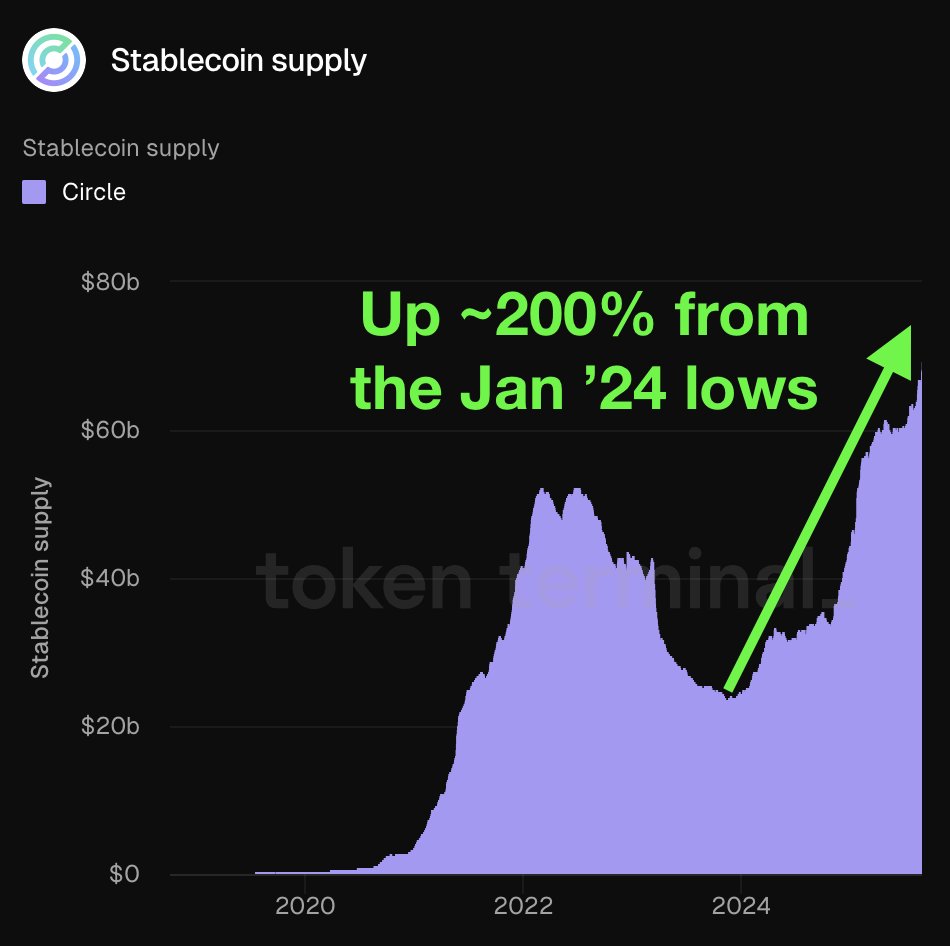 Hey there, crypto enthusiasts! If you've been keeping an eye on the blockchain world, you might have caught this exciting update from Token Terminal on X. Circle, the company behind the popular stablecoin USDC, has seen its supply skyrocket by about 200% since the lows back in January 2024. For the first time ever, it's crossed the $70 billion mark. That's a huge deal, and it could mean big things for the meme token scene we're all obsessed with here at Meme Insider.